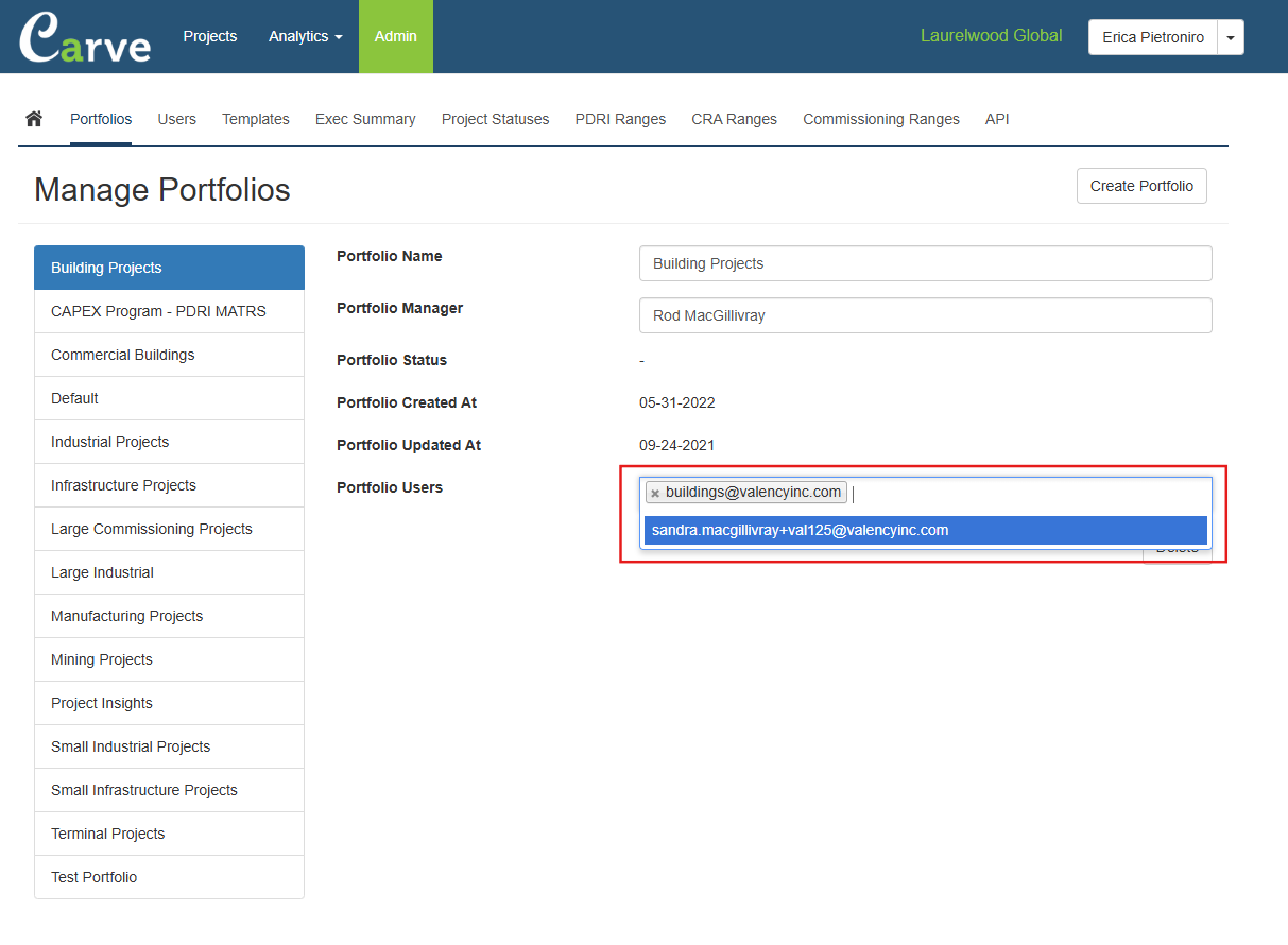 - Click in the Portfolio Users textbox and select the Carve users who should have access to this portfolio. If the name is not listed, go to Users and confirm that they are set up.