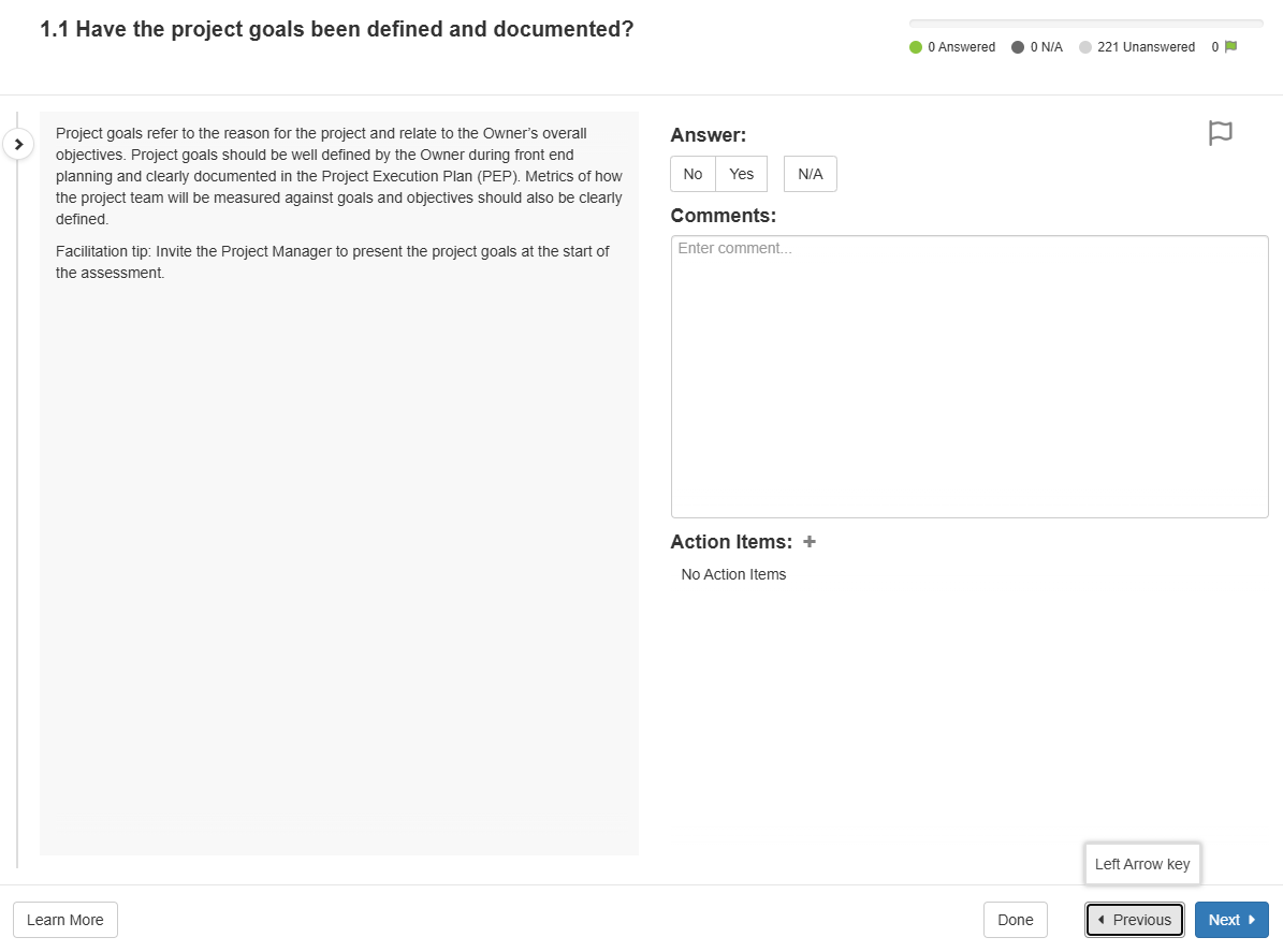 The self assessment navigation bar contains three key buttons for navigating an assessment. To exit the facilitation of a self assessment, press the "Done" button. To advance between factors in an assessment, the "Next" and "Previous" buttons can be used. In addition to these buttons, the arrow keys on your keyboard can also be used to navigate through an assessment.