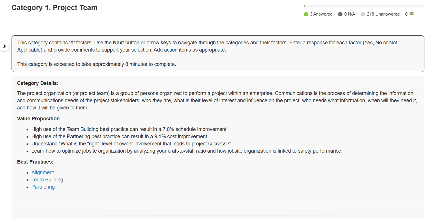 Assessment factors also each contain a title and description describing the project consideration that they represent. It is recommended that the assessor thoroughly reads these descriptions before any response is given.