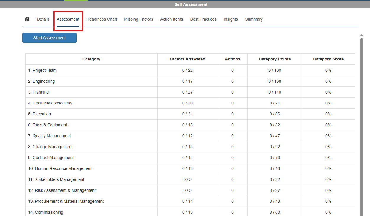 Within the assessment, select the Assessment tab shown in the image below. Starting on this tab you will see an overview of all categories within the assessment, along with the current progress of answered factors. To begin filling out the assessment, click the "Start Assessment" button.