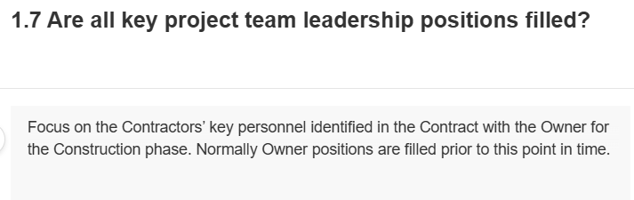 - Record comments describing the current state of the project in relation to the factor description / question