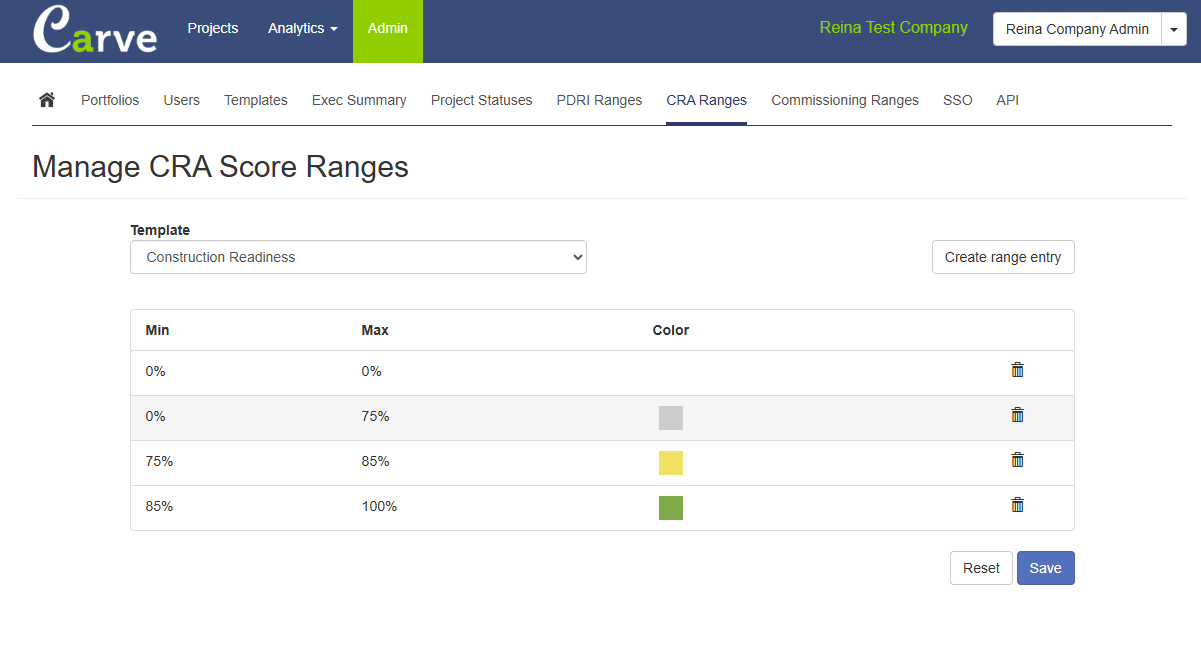 Modifying Construction Readiness (CRA) Score Ranges and Associated Colours