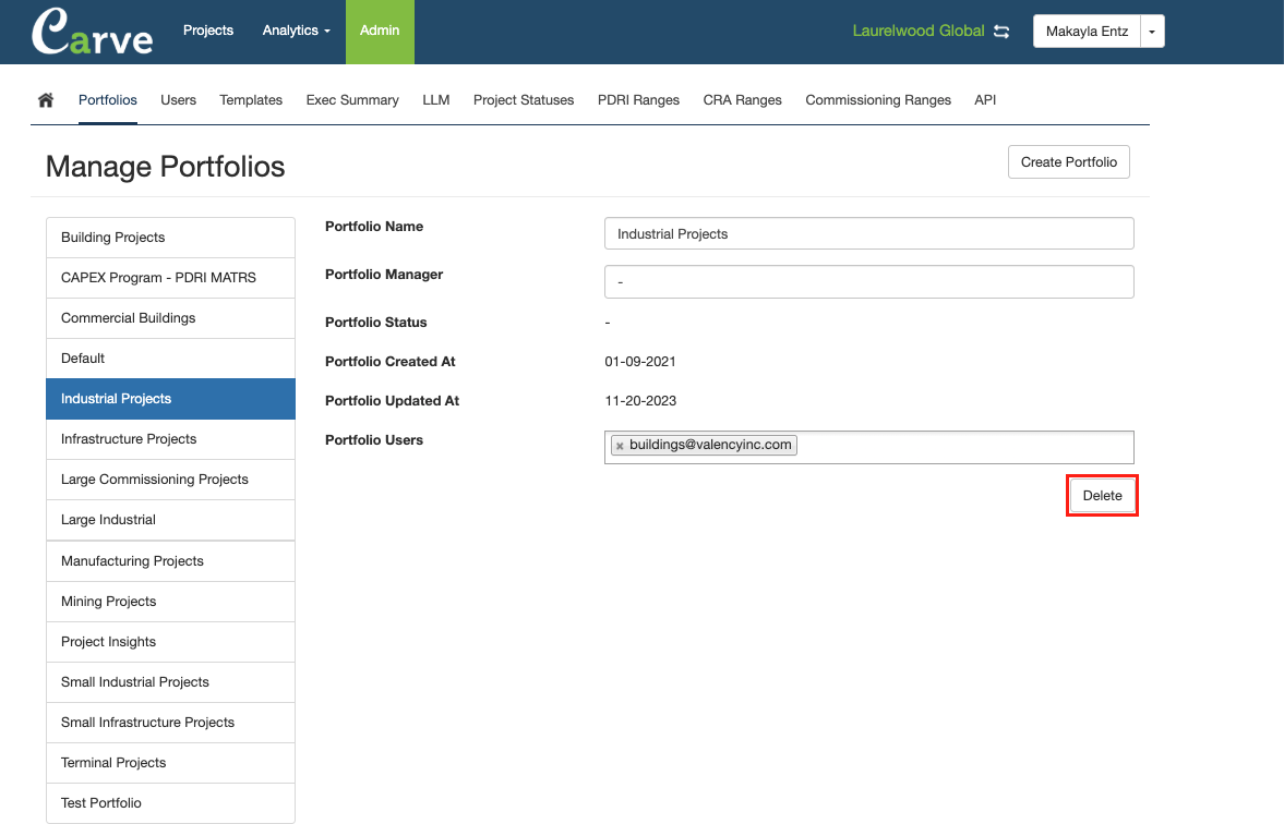From the Admin tab, select Portfolios. Click on the portfolio to be edited. Fields available for editing include: Portfolio Name Portfolio Manager Portfolio Users Manage Portfolios