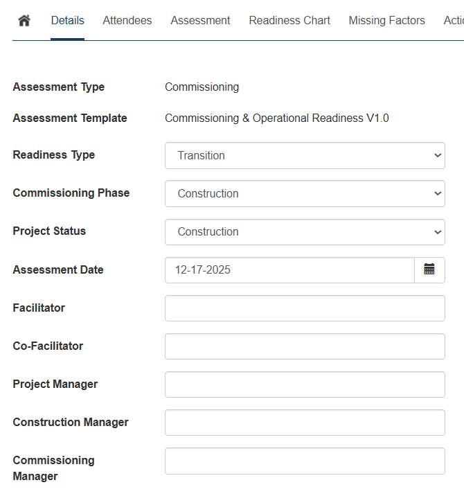 - Commissioning Phase (pre-populated with the selected Commissioning Phase while creating the Assessment)