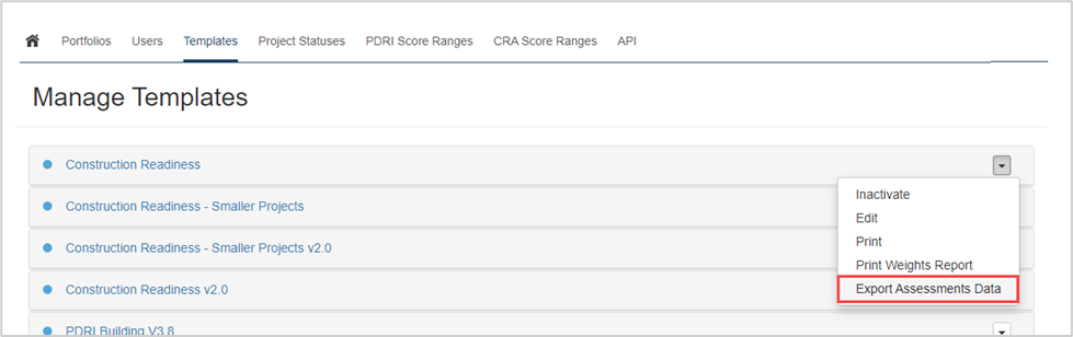 Company Admin users can export their assessments in .csv format on a template by template basis from the Templates tab.