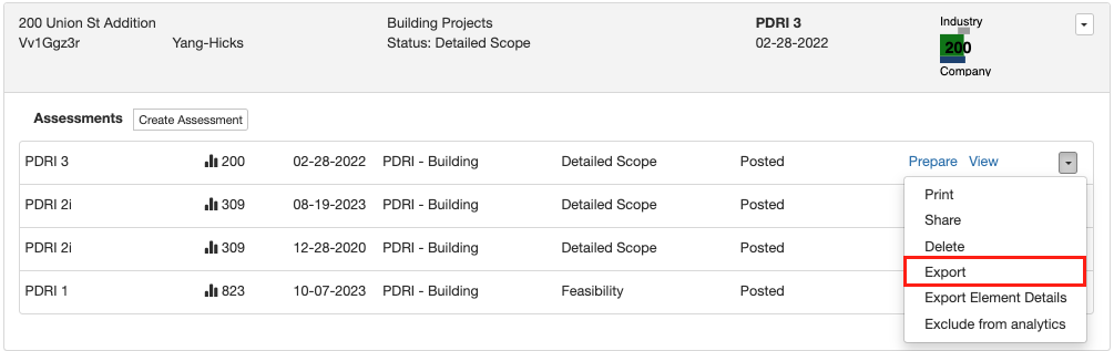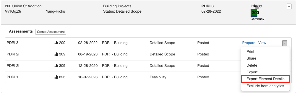 Element/factor details from a project assurance assessment can be pulled to show the element/factor, the assigned level/answer, the weighted score (PDRI only), the company average (PDRI only), the related action items, and the associated comments. To export the element details of a project as a .csv file: