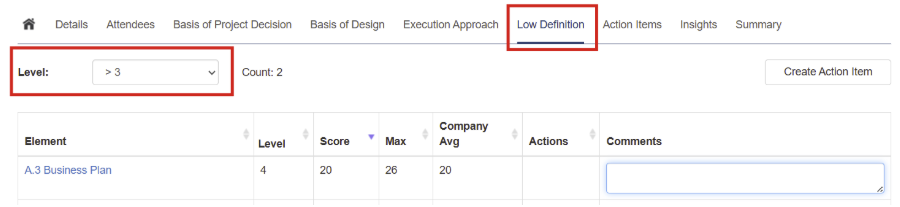 - On the Low Definition/Gaps Tab, select the range of elements present in the report using the level dropdown.
