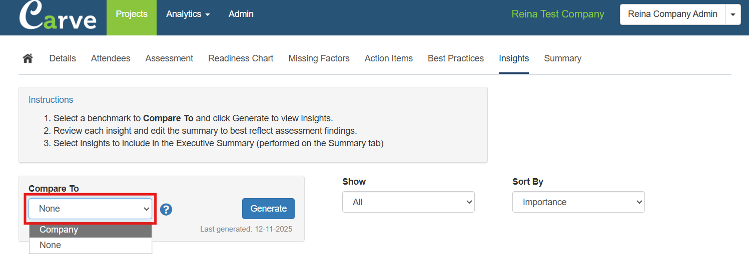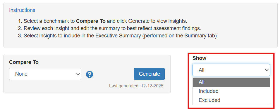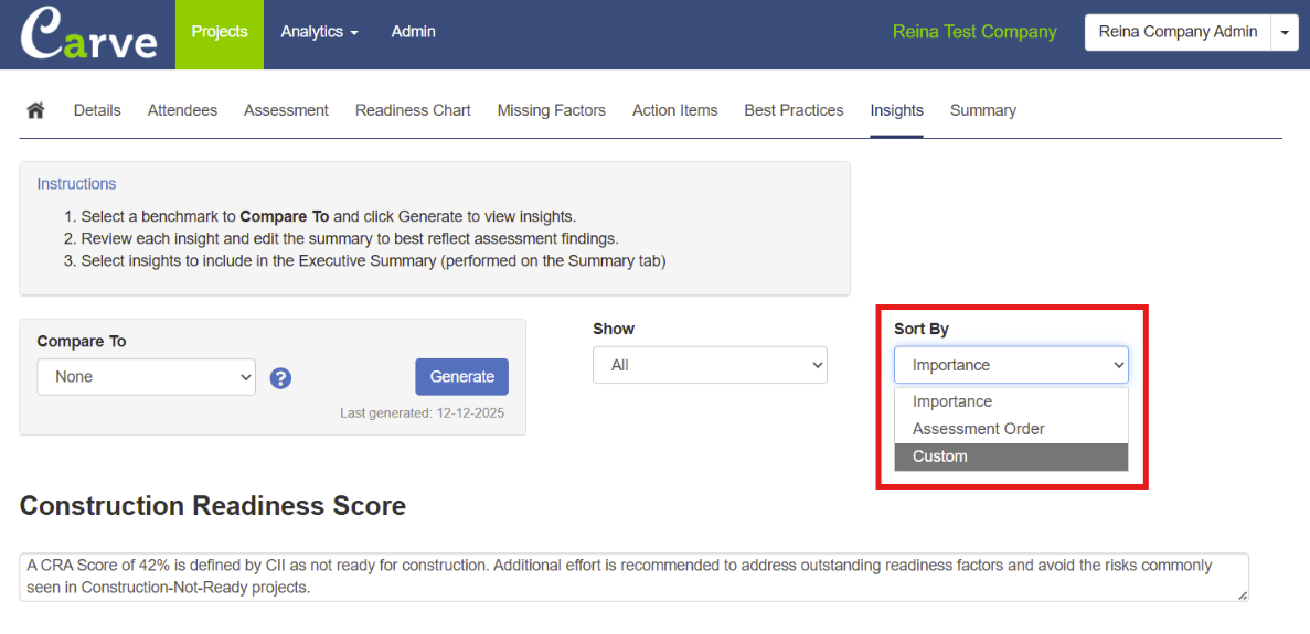 After the assessment insights have been generated, a 'Sort By' dropdown will appear beside the 'Show' dropdown, which allows you to sort the generated insights by importance, assessment order. This dropdown will automatically change to 'Custom' if you manually reorder the insights.