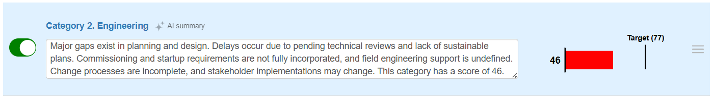 Insights are generated according to the selected benchmarking comparisons and use embedded expert logic to identify key outliers. AI summaries are created for each insight using the related comments and action items from the assessment. The 'AI summary" tag is used to highlight which insight descriptions have been generated using AI.