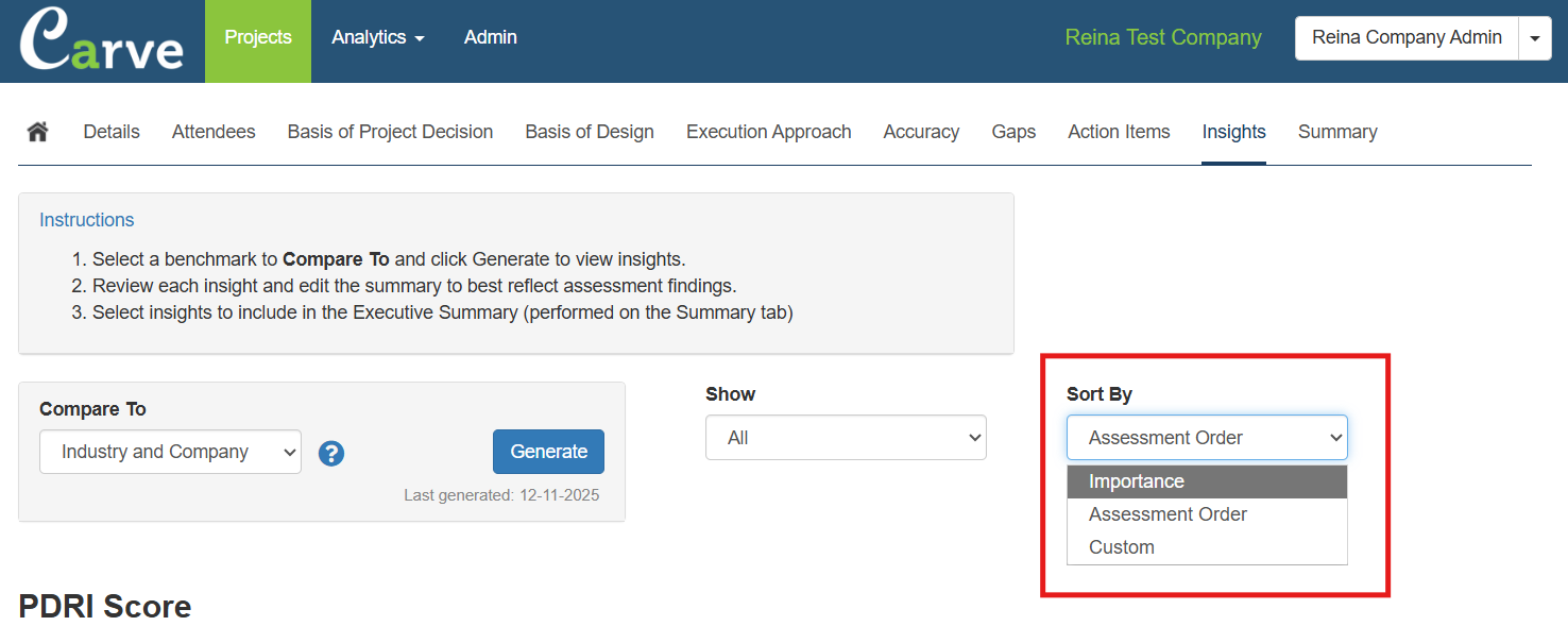 After the assessment insights have been generated, a 'Sort By' dropdown will appear beside the 'Show' dropdown, which allows you to sort the generated insights by importance, assessment order, or a custom order (manually drag and drop to re-order insights).