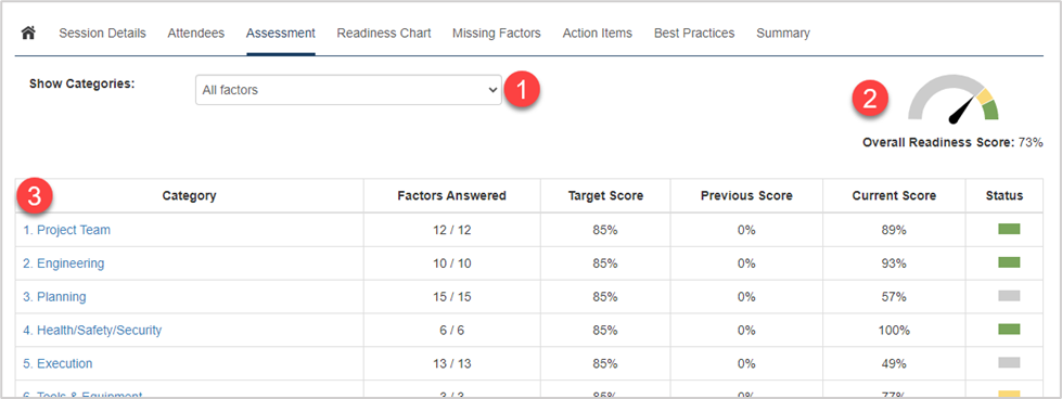 - A gauge that tracks the overall score as the team progresses through the assessment